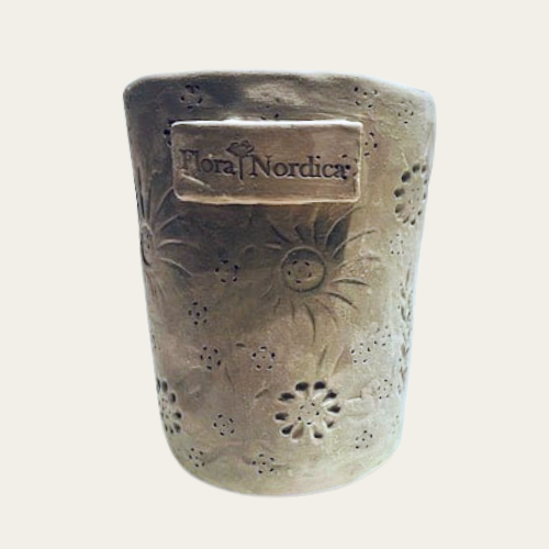 En håndlavet Flora Nordica keramikvase skabt i naturens rolige udtryk. Med fine blomsterdetaljer og et råt, nordisk look er den perfekt til buketter og som dekorativt element i hjemmet.