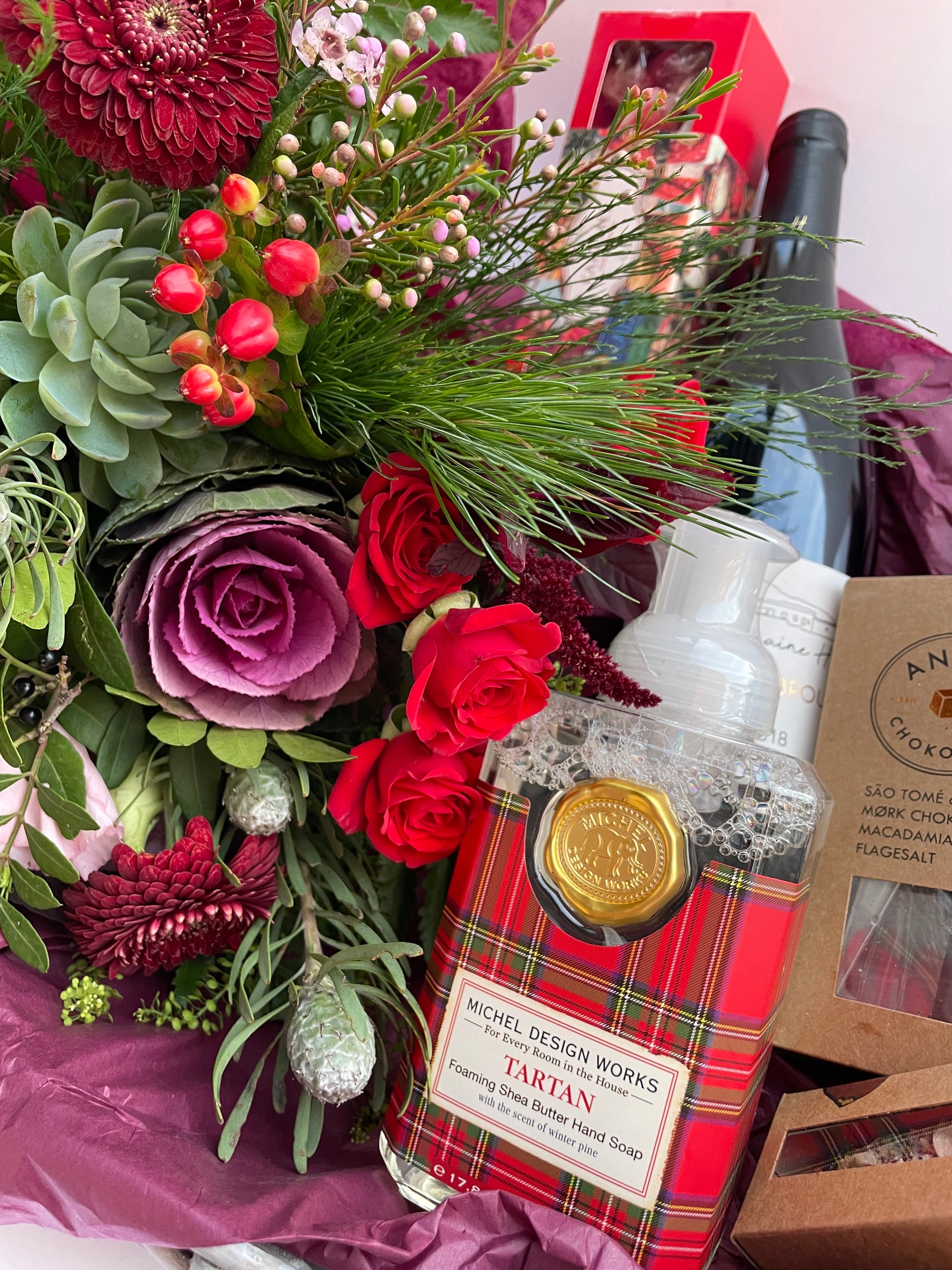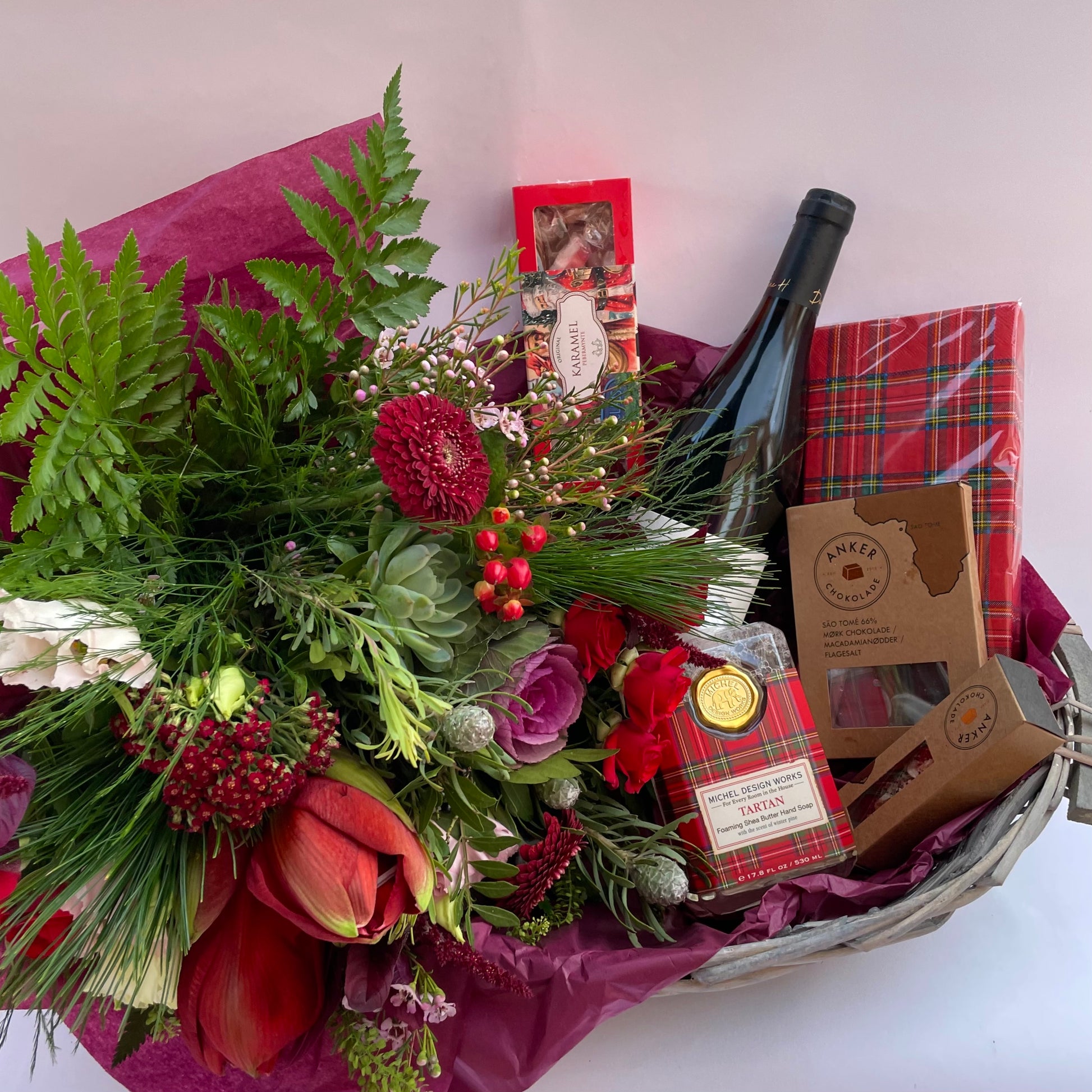 (Gavekurven på billedet er til kr. 1.000,- og indeholder en smuk julebuket, en flask rødvin af god kvalitet, servietter og skumsæbe fra Michel Design, karameller og chokolade.